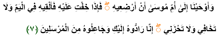 7We (Allah) inspired the mother of Moses: “Nurse him (Moses) but when you fear for him, cast him into the river (to save him from being slaughtered by Pharoah’s soldiers) and do not be terrified or grieve. For sure, We will bring him back to you and will make him one of the Messengers.” [28:7]